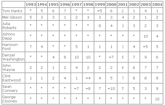 Tom Hanks Is America's Favorite Movie Star Tuesday January 4, 9:41 am ET Mel Gibson and Julia Roberts fall to #2 and #3 while Johnny Depp shows biggest gain from #10 to #4 ROCHESTER, N.Y., Jan. 4 /PRNewswire/ -- Every year at this time The Harris Poll? asks a nationwide cross-section of adults who their favorite movie star is. This year Tom Hanks recaptures the top spot, moving up three places from #4 last year. Mel Gibson, who had taken over first place last year, drops slightly to #2 this year. Rounding out the top four most popular stars are Julia Roberts at #3 and Johnny Depp at #4. These are the results of a nationwide poll of 1,015 U.S. adults surveyed online by Harris Interactive? between December 8 and 15, 2004. The "top ten" list is remarkably stable again this year. Nine of the 10 stars in this year's top-10 list were also on last year's list, and the changes in the rankings are relatively modest. In addition to Tom Hanks moving up from #4 to #1, other changes include: * Mel Gibson drops one place from #1 to #2. He continues to be one of America's most consistently popular stars, having been in the top four since 1994. * Julia Roberts, the only woman in the top 10, drops one place from #2 to #3. She also shows stability in her fan base, sharing one of the top four places since 2000. * Johnny Depp continues his rise in popularity showing the most substantial change, moving up six places from #10 last year to #4 this year. * Denzel Washington moves up to #6 (from #9 last year), his best showing since 1995. * Sean Connery who was #3 falls to #9. * George Clooney joins the top 10 coming in at #10 as Tom Cruise (#5 last year) falls off the list this year. Others whose positions did not change from 2003 are Harrison Ford at #5, John Wayne at #7, and Clint Eastwood at #8. The continuing popularity of John Wayne is, of course, quite extraordinary. It is now 25 years since he died in 1979. No other dead movie star has ever made it into the top 10 since Harris Interactive began asking this question 11 years ago. Most of his fans are men though this year men choose Hanks or Gibson as their favorite. Wayne still does remarkably well. Interestingly Tom Hanks is #1 among both men and women; Julia Roberts is a close second among women. The star on the rise this year is Johnny Depp fueled in part by his #1 appeal among people aged 18-29 (who are far more important to the movie industry as they go to the movies much more often than their elders). Denzel Washington retains his #1 position among African Americans. Hispanics pick Johnny Depp as their favorite. When the replies are analyzed by party affiliation, Republicans prefer Mel Gibson as their #1 while Democrats like Tom Hanks. Among Independents, however, Robin Williams is tops. TABLE 1 FAVORITE MOVIE STAR "Who is your favorite movie star?" Base: All Adults ![]() * Not in top 10. DROPPED OUT OF TOP TEN THIS YEAR Tom Cruise (#5 in 2003) TABLE 2 WHICH MOVIE STAR IS #1 AMONG DIFFERENT GROUPS? Bases/Groups as listed below: Favorite Movie Star Men: Tom Hanks Women: Tom Hanks People aged 18-29: Johnny Depp Whites: Mel Gibson African Americans: Denzel Washington Hispanics: Johnny Depp Republicans: Mel Gibson Democrats: Tom Hanks Independents: Robin Williams Methodology The Harris Poll? was conducted online within the United States between December 8 and 15, 2004 among a nationwide cross section of 1,015 adults (aged 18 and over). Figures for age, sex, race, education, region and household income were weighted where necessary to bring them into line with their actual proportions in the population. Propensity score weighting was also used to adjust for respondents' propensity to be online. In theory, with probability samples of this size, one could say with 95 percent certainty that the results have a sampling error of plus or minus 3 percentage points of what they would be if the entire U.S. adult population had been polled with complete accuracy. Unfortunately, there are several other possible sources of error in all polls or surveys that are probably more serious than theoretical calculations of sampling error. They include refusals to be interviewed (nonresponse), question wording and question order, interviewer bias, weighting by demographic control data and screening (e.g., for likely voters). It is impossible to quantify the errors that may result from these factors. This online sample was not a probability sample. These statements conform to the principles of disclosure of the National Council on Public Polls. # by Olsen | 2005/01/05 12:53 | 존 웨인(John Wayne)