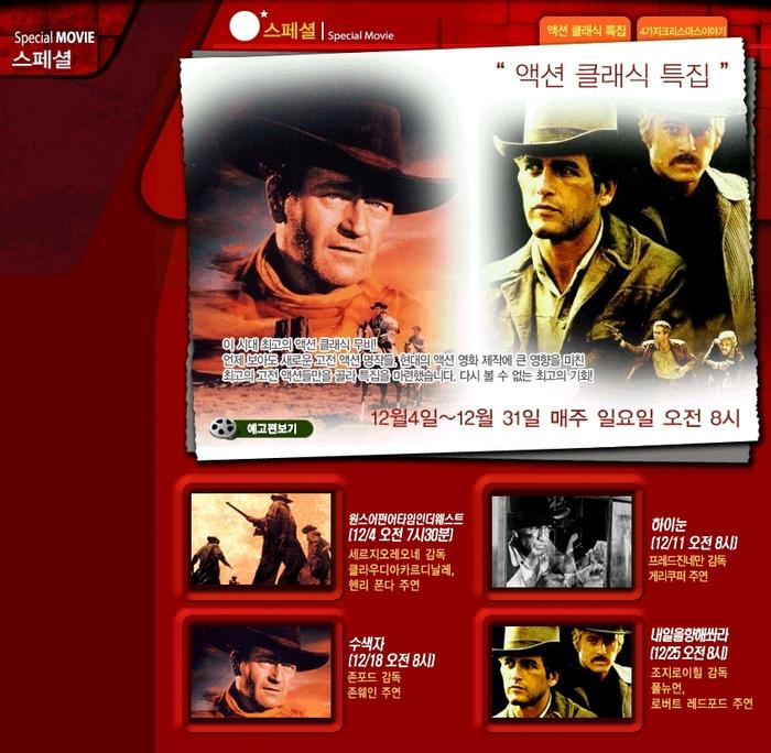 케이블 채널 수퍼액션에서 12월 4일부터 4주 동안 매주 일요일 오전 8시에 [액션 클래식 특집]이란 걸 편성했는데 그 중에 [수색자]가 들어있다. [수색자]를 DVD로 갖고 있으면서도 이런 뉴스를 보면 가슴이 두근거린다.