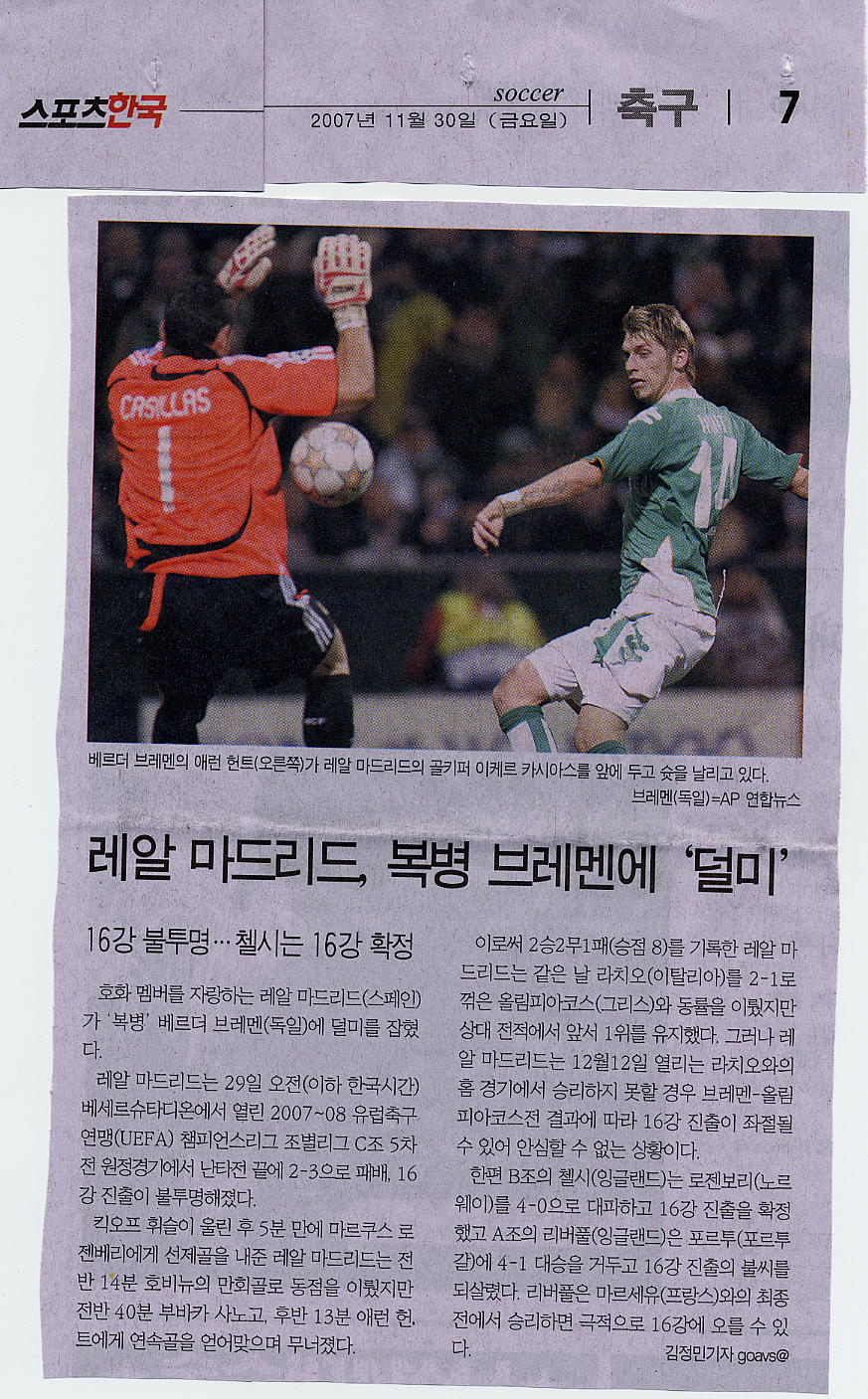 레알 마드리드 이겨야 겨우 기사 하나 실리는구나. 2007년 11월 30일자 조간 무료신문 스포츠한국 7면. 하기야 기사 제목은 짐작대로다. 브레멘 승리가 아니라 레알 마드리드 패배라는 거지. 복병이라, 좋게 말해 복병이지 요즘 말로 '듣보잡'이라는 뉘앙스잖겠나. 그나마 다른 무료신문에는 첼시가 로젠보리 원정경기 대승했다는 얘기들 뿐인데 헌트 사진까지 실어줬으니 고맙다. 기념으로 스캔. 클릭하면 크게 볼 수 있다. # by 파이 | 2007/12/01 10:28 | Pastime