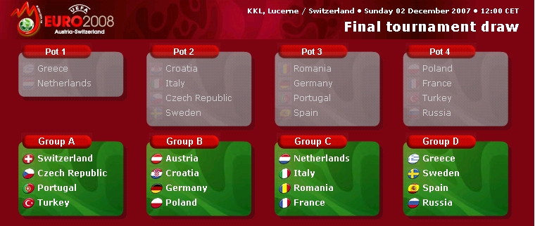 http://www.uefa.com/competitions/euro/fixturesresults/index.html 독일은 오스트리아, 크로아티아, 폴란드와 함께 B조. 유로 본선에서 만만한 팀이 있을까마는 그래도 B조는 독일 입장에서 볼 때 괜찮은 편인 것 같다. C조는 내가 봐도 진짜 제대로 죽음의 조다. 독일 응원하는 사람으로서 솔직히 독일이 C조에 들어가지 않아서 기쁘다. 네덜란드 - 이탈리아 - 독일 - 프랑스가 같은 조가 될 수도 있었다. ![]() ![]() # by 파이 | 2007/12/02 22:06 | Pastime