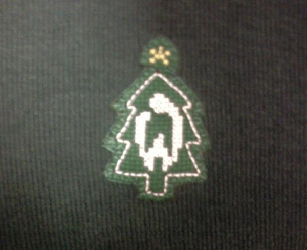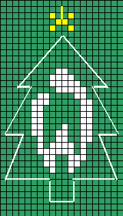 십자수 도안. 녹색 원단에 별과 W만 십자수로 하고, 트리 모양 가장자리는 박음질로 하면서 스웨터에 붙였다.