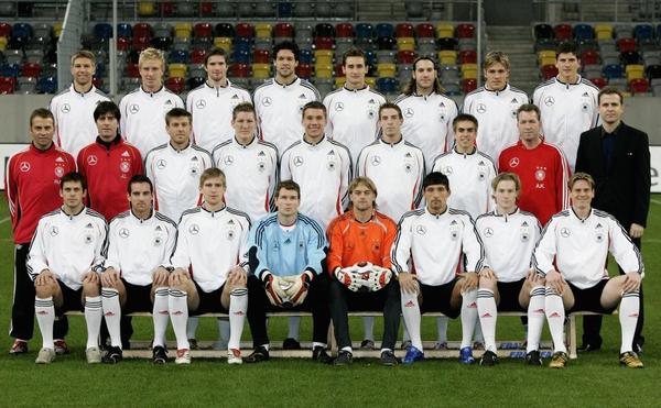 스위스전 (2007-02-07)을 앞두고 독일 국가 대표 축구팀 단체 사진. 포돌스키는 출전 못 하는데도 사진은 찍었음.