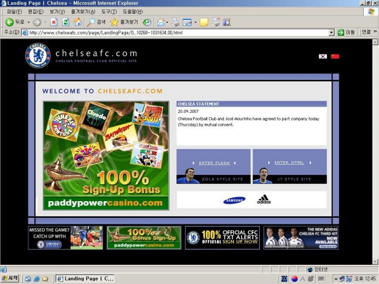 우리나라 시각 2007년 9월 20일 오후 12:45분 현재 첼시 공식 사이트 대문.